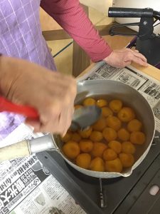 今年も石焼き芋機の登場です。石の温度を180度くらいに保つために、火を強めたり、弱めたりして微調整がとても困難(>_<) 風が強すぎる日は、火が消えてしまったり。。。上手に焼けると30分くらいすると、お芋の甘い匂いが漂ってきますよ。1時間くらいじっくり焼いて出来上がり!!皆さんに満足して頂きました(^^)/