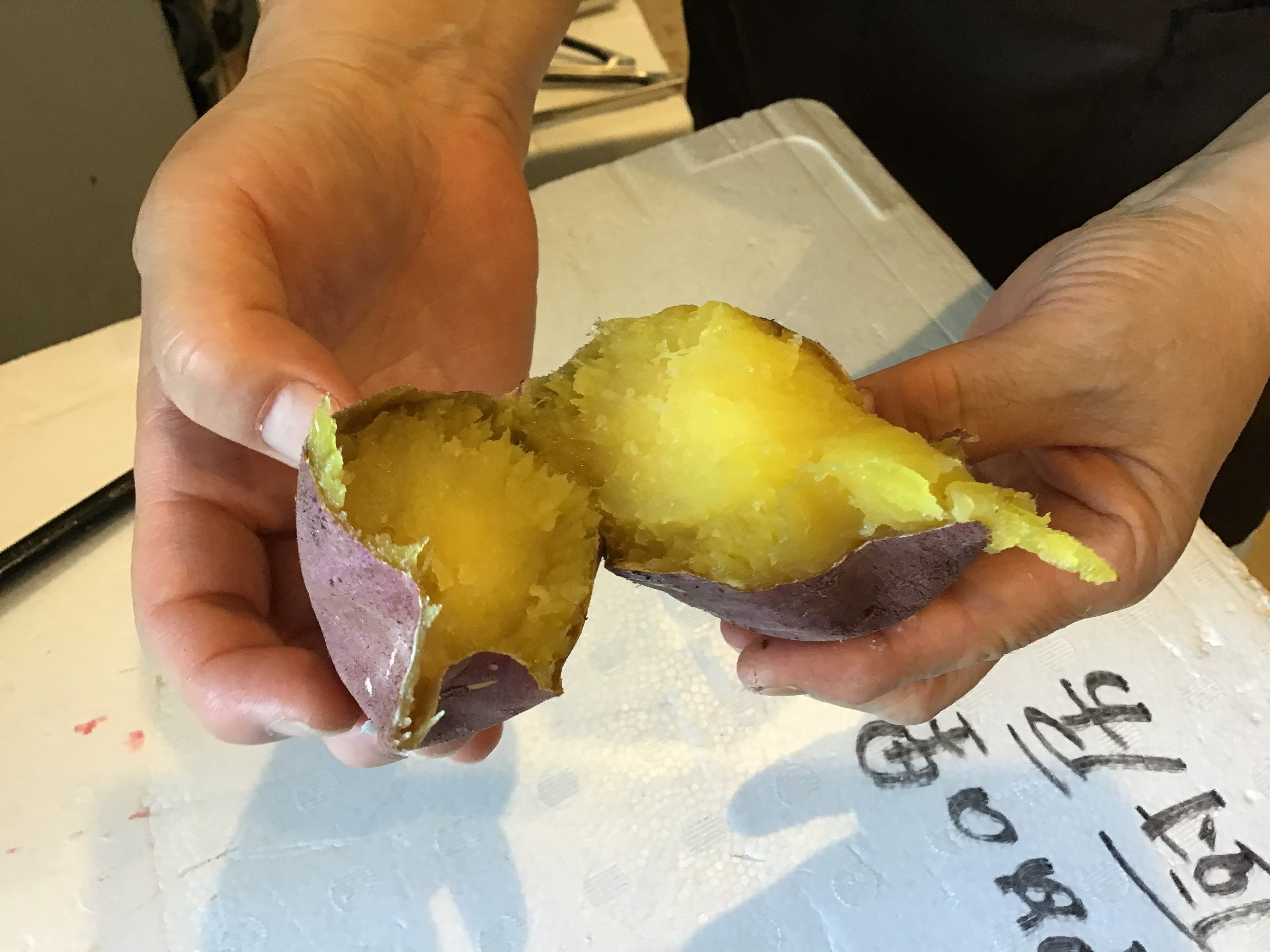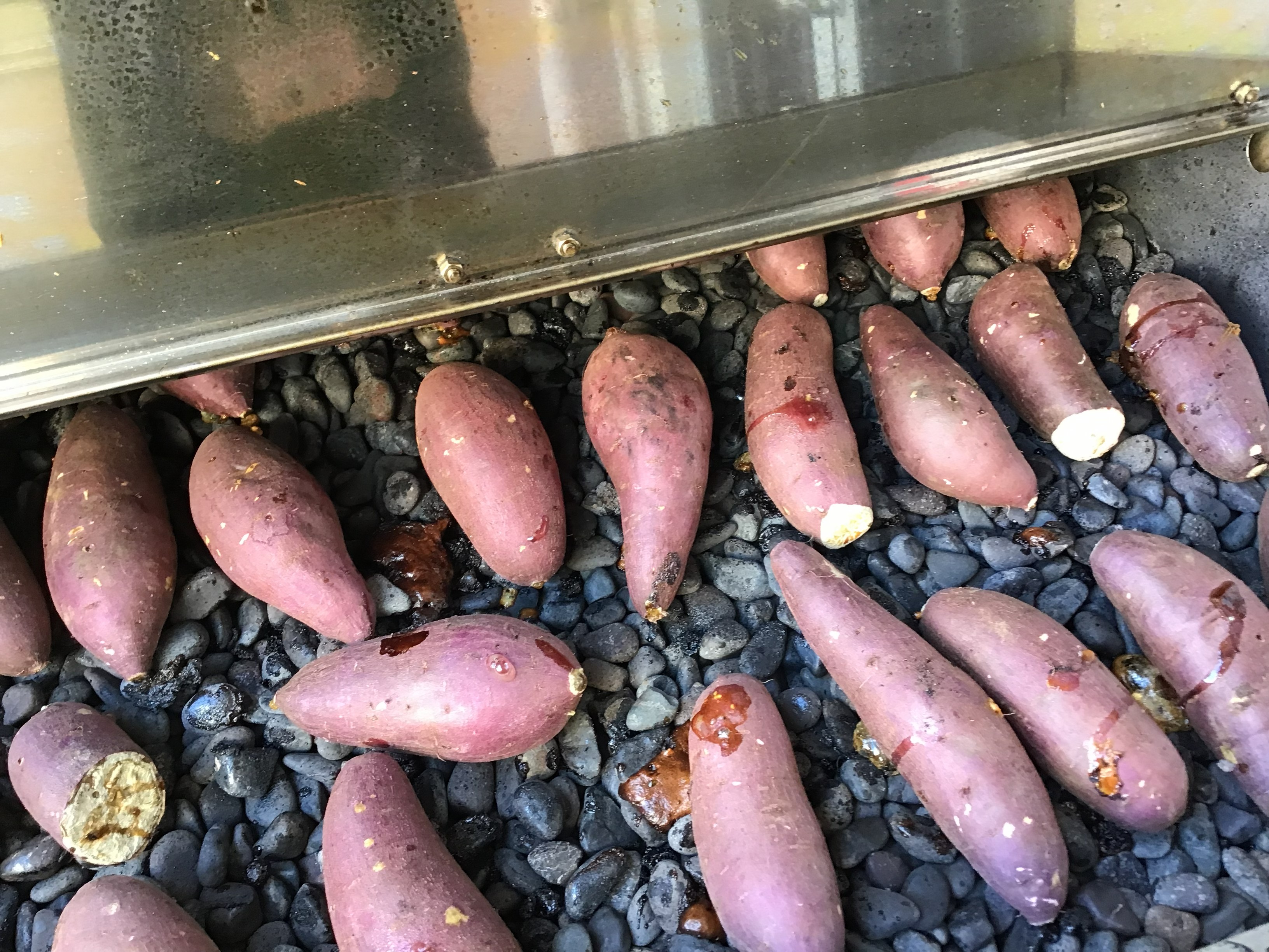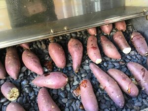 今年も石焼き芋機の登場です。石の温度を180度くらいに保つために、火を強めたり、弱めたりして微調整がとても困難(>_<) 風が強すぎる日は、火が消えてしまったり。。。上手に焼けると30分くらいすると、お芋の甘い匂いが漂ってきますよ。1時間くらいじっくり焼いて出来上がり!!皆さんに満足して頂きました(^^)/