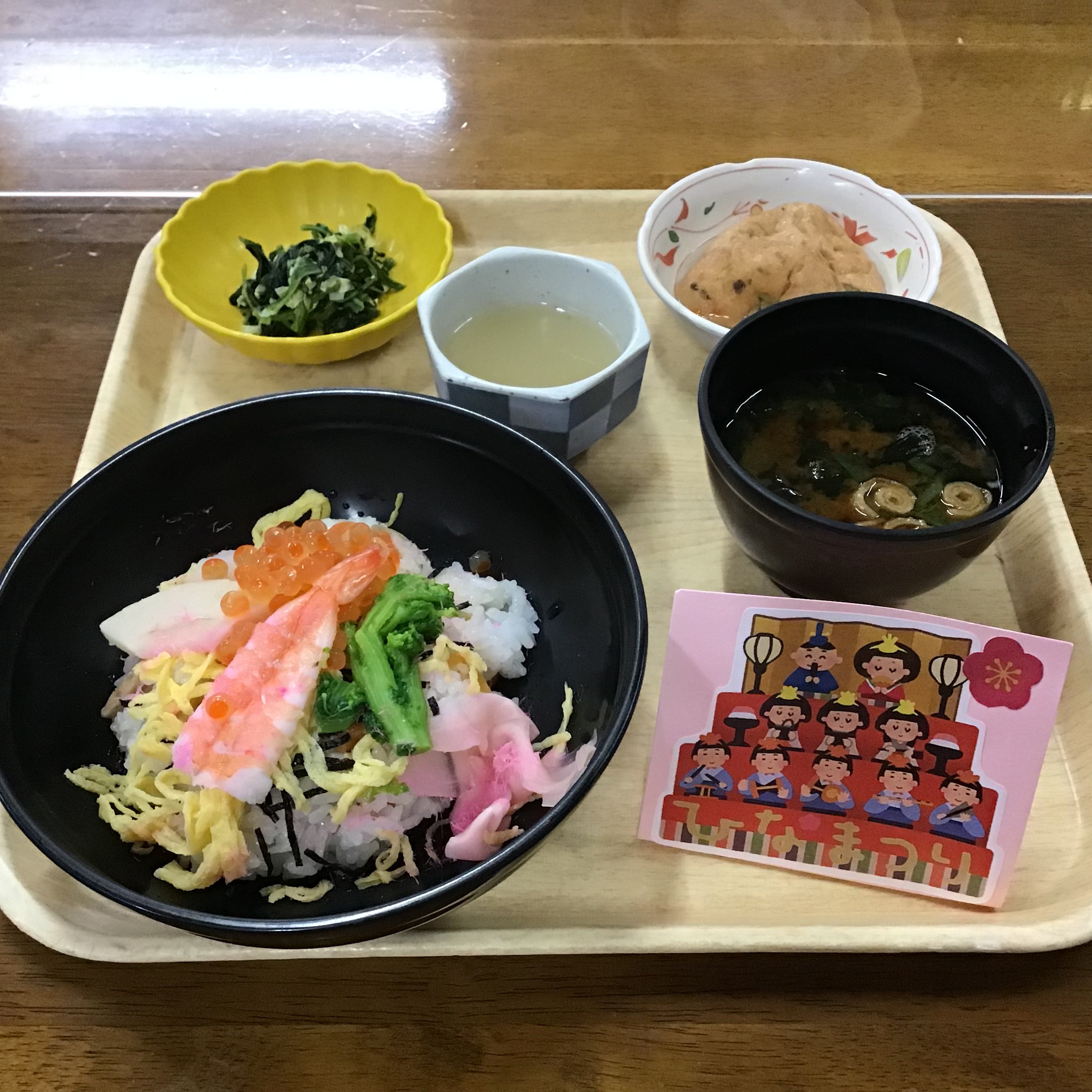 そして、3月3日の桃の節句は、ひな祭り寿司でした。春らしく菜の花を添えました。かわいいカードも喜んでいただけました。