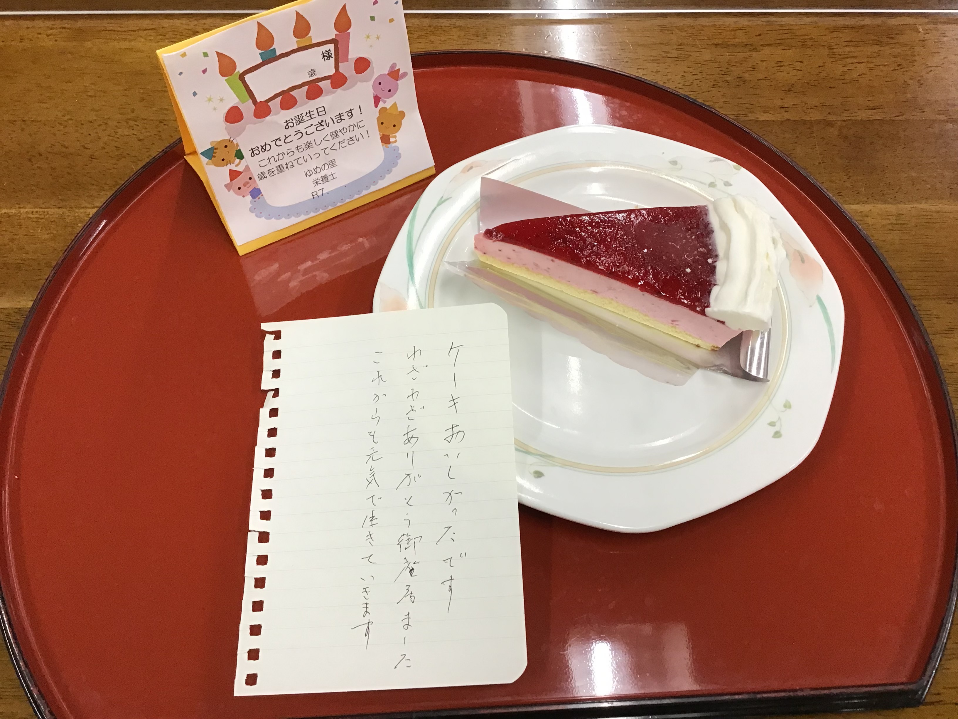 先日、誕生日を迎えた利用者様より、『ケーキ おいしかったです。わざわざありがとう御座いました。これからも元気でいきていきます』とお礼のお手紙をいただきました。