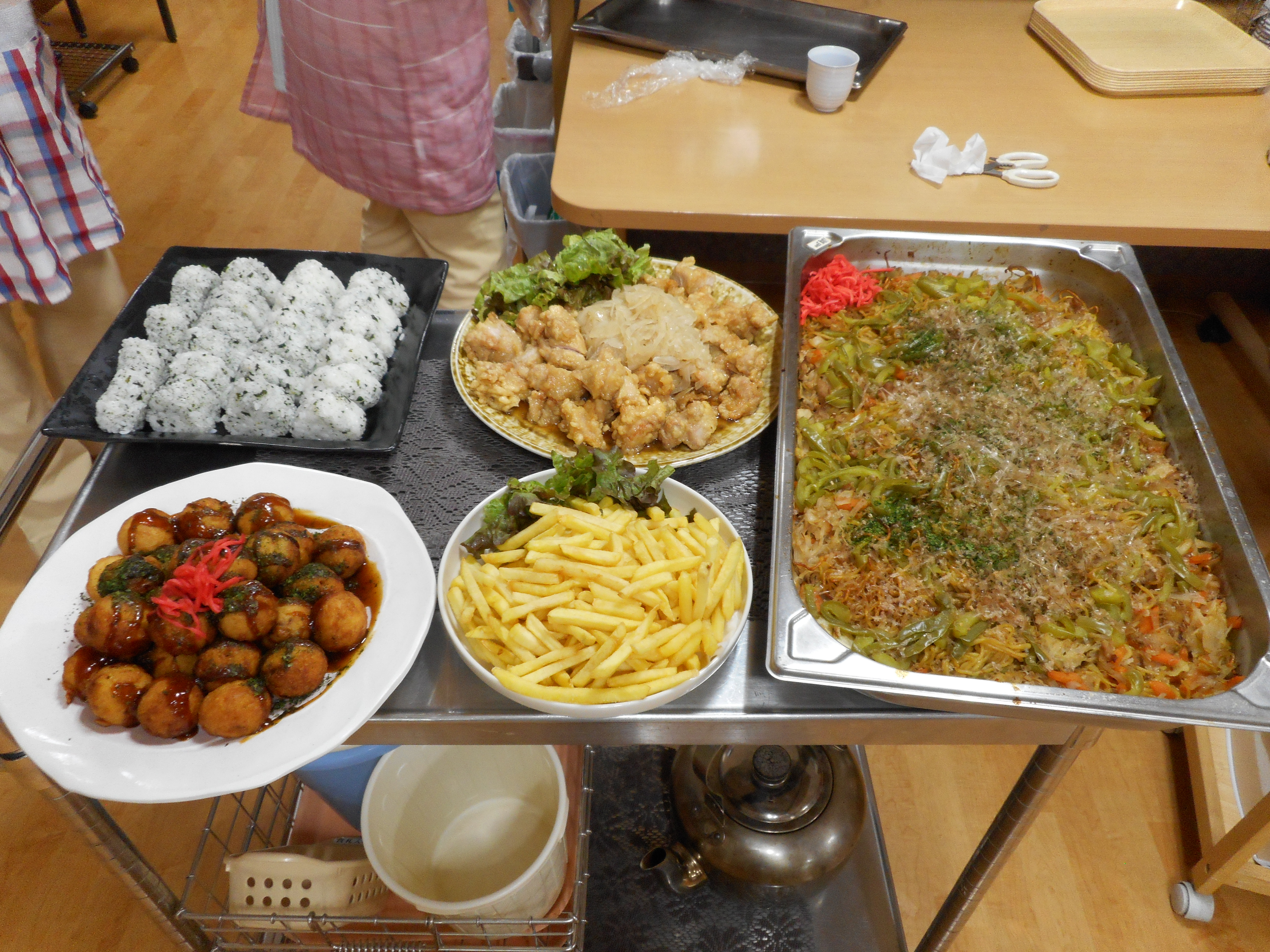 昼食は、夏祭りバイキングで、唐揚げに焼きそば、ポテトにおにぎりなど