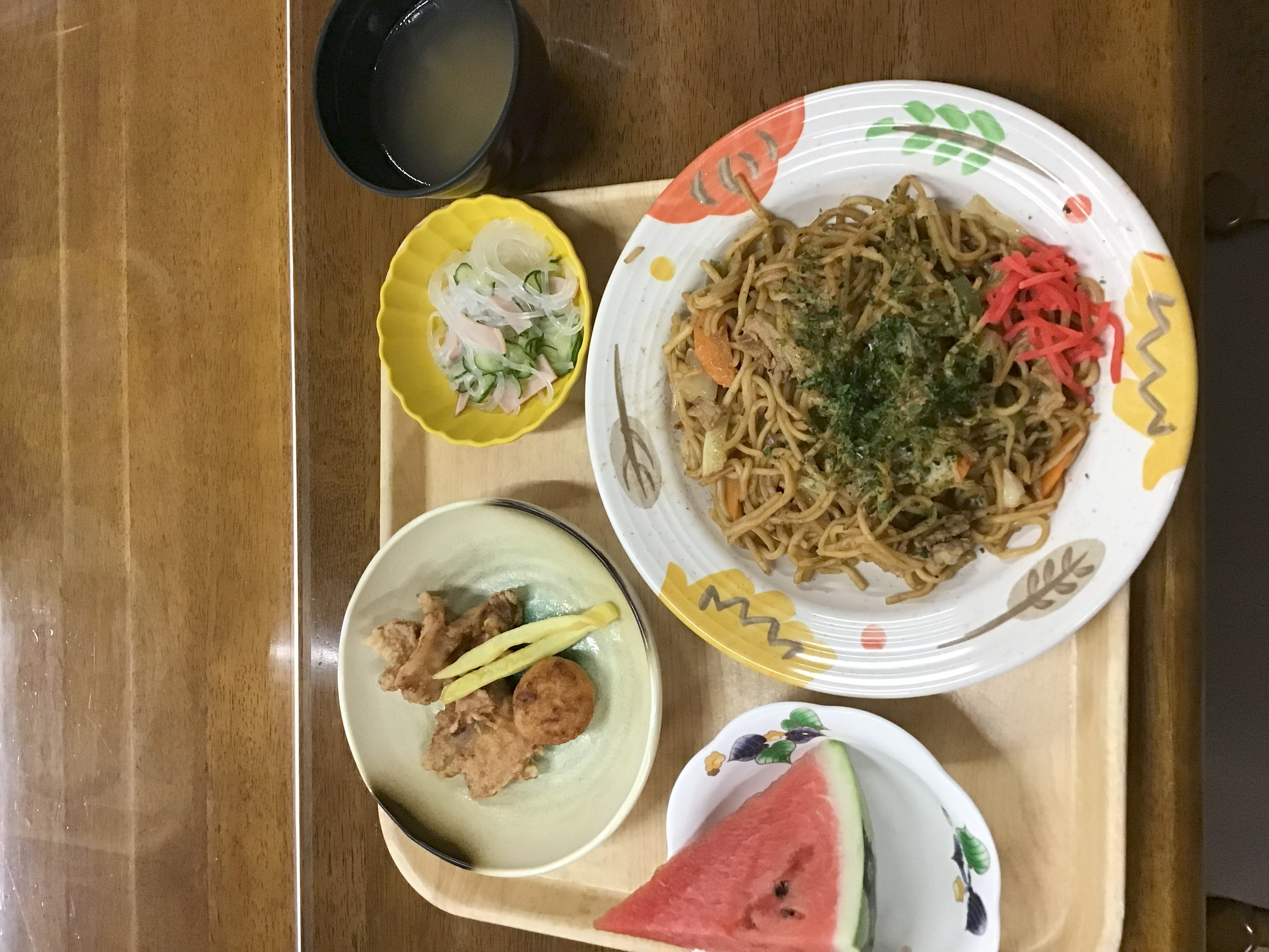 8月17日(日)にデイケアで、バイキングを行いました。お祭り気分が味わえるようなメニューを揃えました。利用者さんは、「全部とりたいなぁ。」「迷うなぁ。」などなどお話しながら選んでくれていました。私も、当番で出勤だったので美味しい焼きそばを食べることができましたよ。