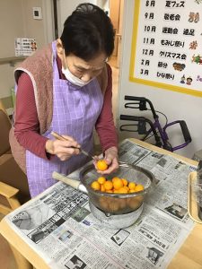 退所前訪問指導でRさんとリハビリ職員と相談員、居宅のケアマネさんも同行して自宅へ伺いました。玄関先には金柑の木🌳たわわになっている。ちぎって~食べてごらんと声をかけてもらったので早速味見!!! あま~~い美味しい😋と声が出ちゃいました。ちぎって持って帰ればいいと声かけてくださり、金柑をポケットにいっぱい詰め込みゆめの里へ持って帰ってきました。