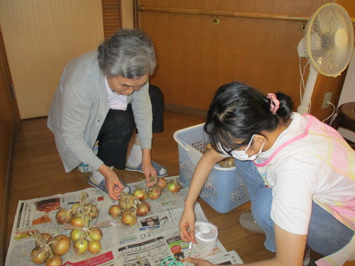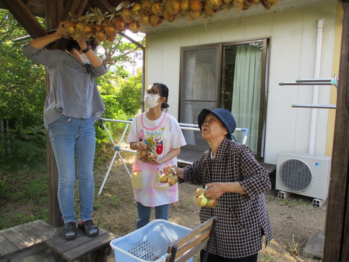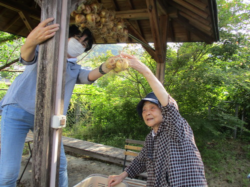 玉ねぎ こんにちは グループホームいつもえがおで 希望ユニットのmiyuです。 グループホームの畑でたくさん玉ねぎが出来たので保存用に吊るす事にしました。 入居者様が玉ねぎを束ねる方法を教えてくださったので、あっという間に束ねる事が出来ました。 入居者様から手渡ししてくださり、軒の下に吊るして完成!! 美味しい玉ねぎ料理を作ります!!!