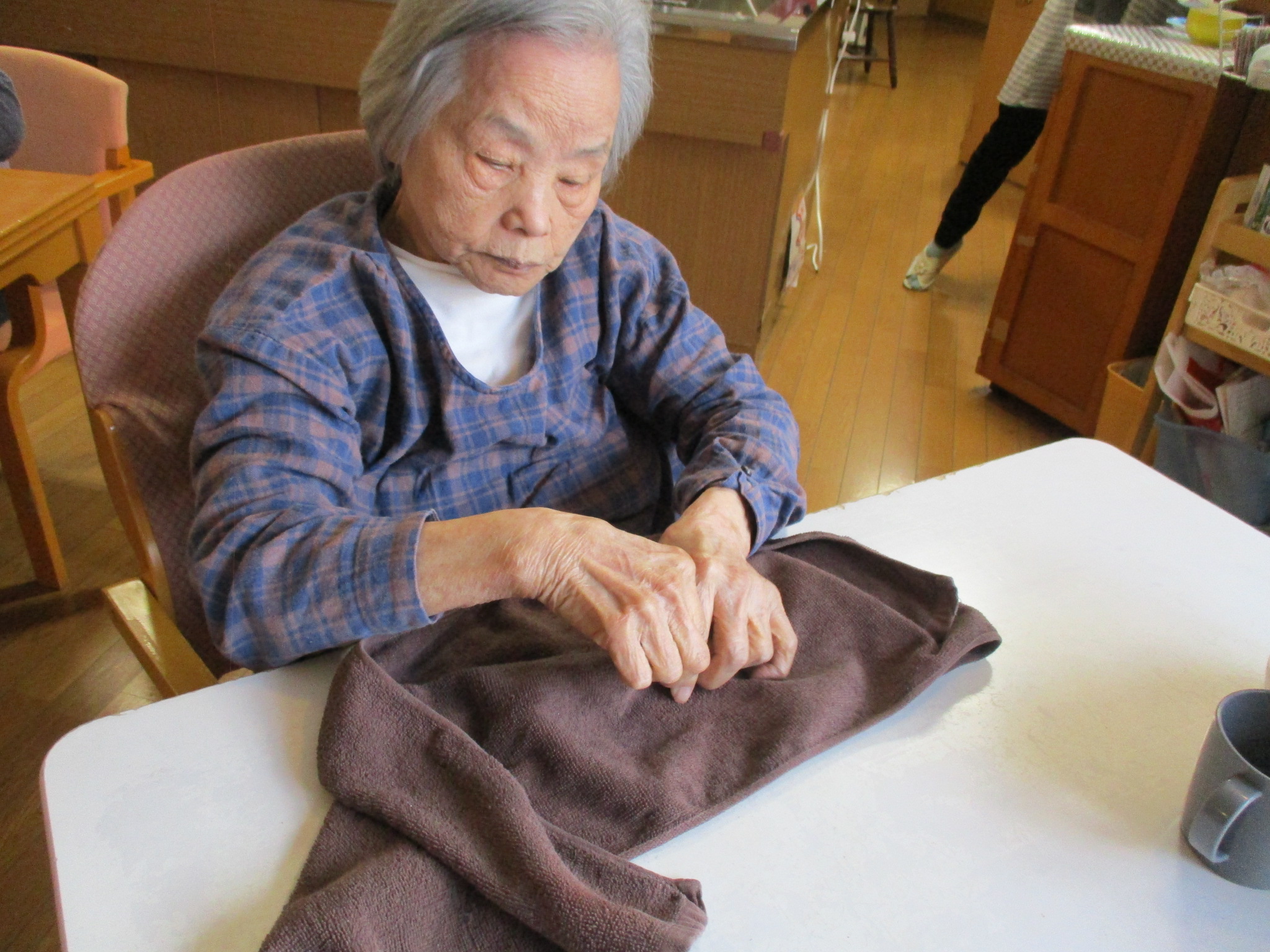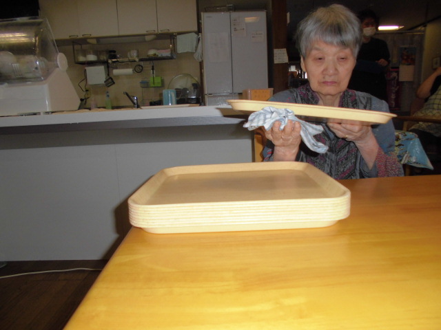 グループホーム えがおをみせてでは、日々の生活の場での生活リハビリや余暇活動として、入居者様と共におぼんを拭いたり、洗濯物をたたんだりとゆっくりと楽しく時間を過ごしています。