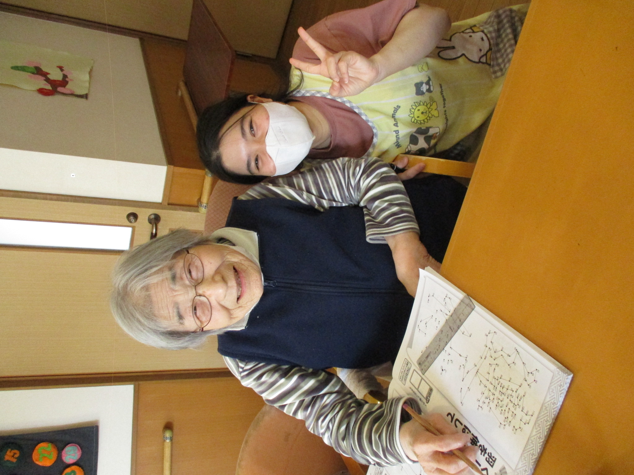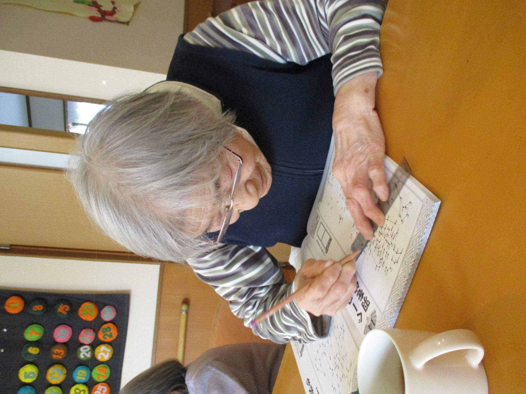 また、入居者様は計算問題・塗り絵・点つなぎなどの脳トレにも取り組まれています。