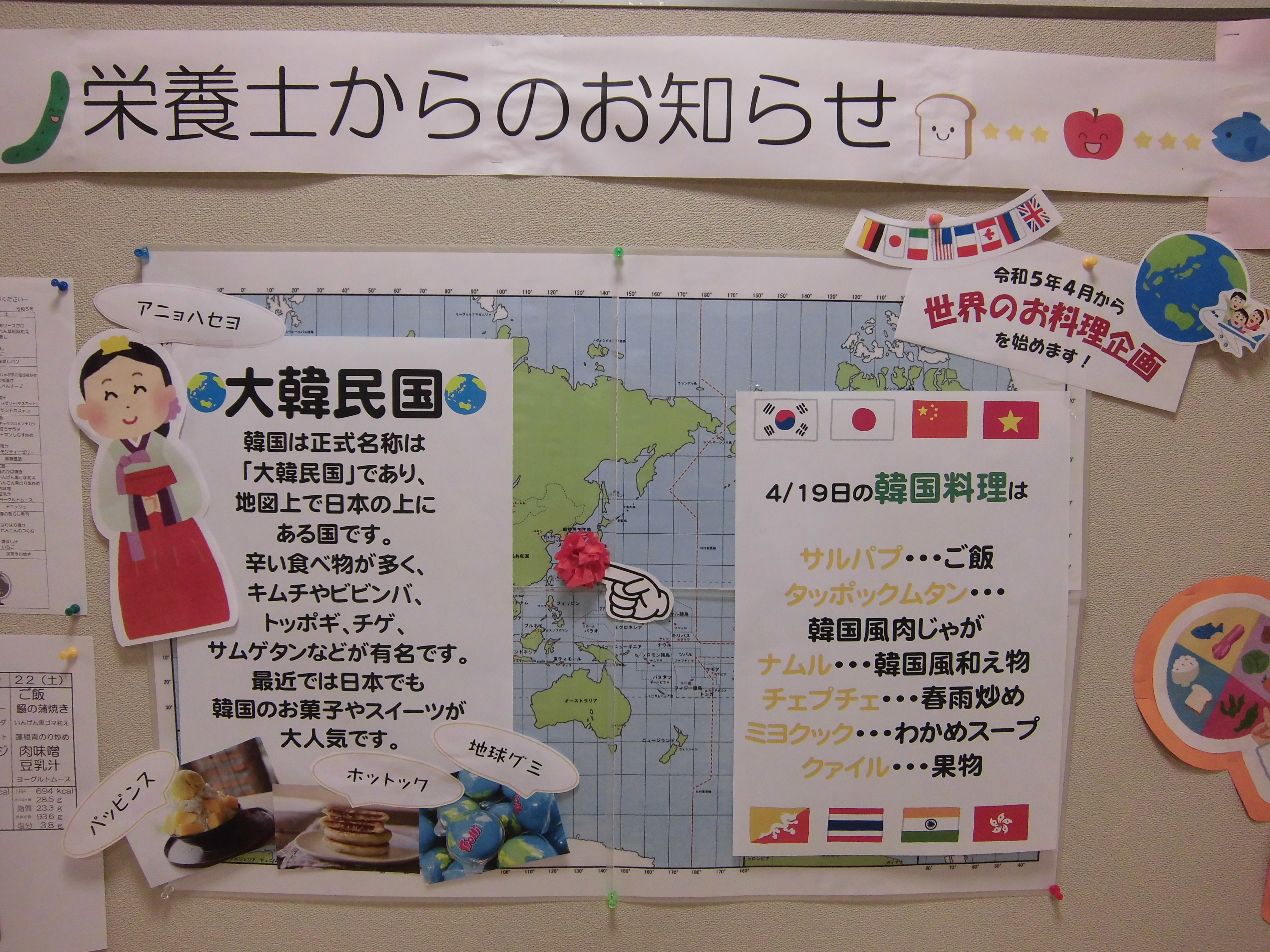 栄養士のお知らせ掲示板に世界地図を作っています。各国の料理にまつわる話も掲示しています。