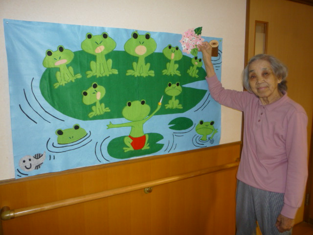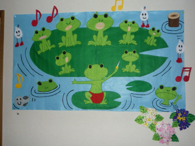 今月も梅雨入り間近ということもあり、「カエルの合唱」の壁飾りを作ってみました。