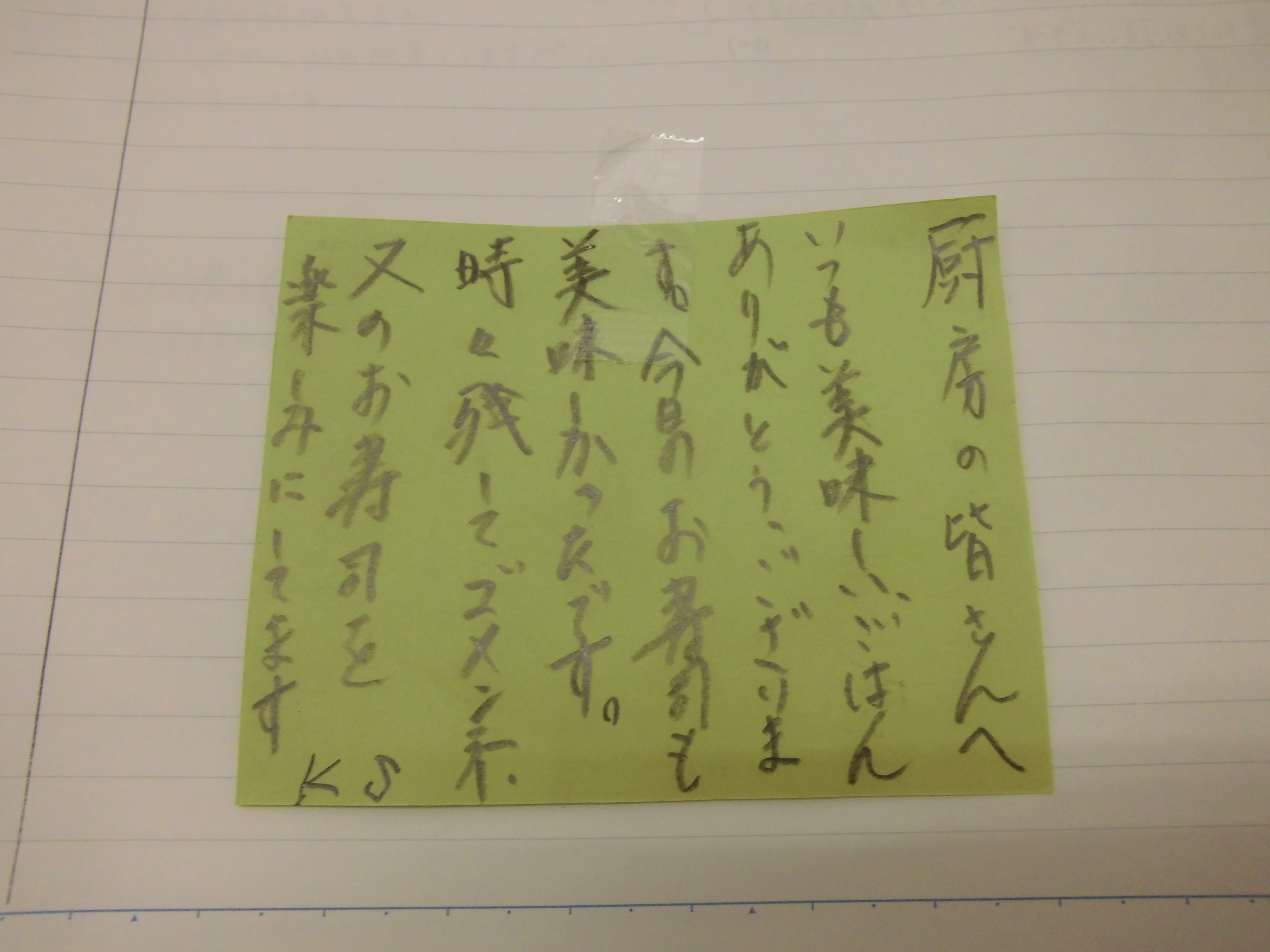 そして、先日、うれしいお手紙を頂きました。食べることが大好きな利用者様で、いつも献立表をみて「今週は、お寿司ないね」「お寿司は、毎週でもいいよ」などなど、色々なお話をしてくれます。